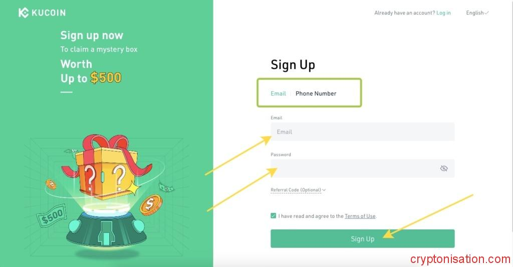 Początek rejestracji na Kucoin - W nowym oknie wybierz sposób rejestracji: przez e-mail lub numer telefonu;