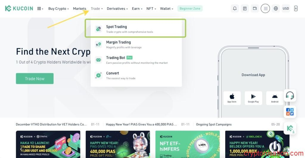 Aby przełączyć się na handel automatyczny na Kucoin, wybierz Trade → Trading Bot.