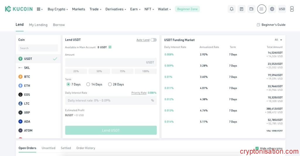 Na Kucoin dostępne są do pożyczania dziesiątki walut cyfrowych oraz różne opcje okresu kredytowania (7/14/28 dni). Użytkownicy mogą udzielać pożyczek w kryptowalutach (Lend), jak również pożyczać (Borrow).