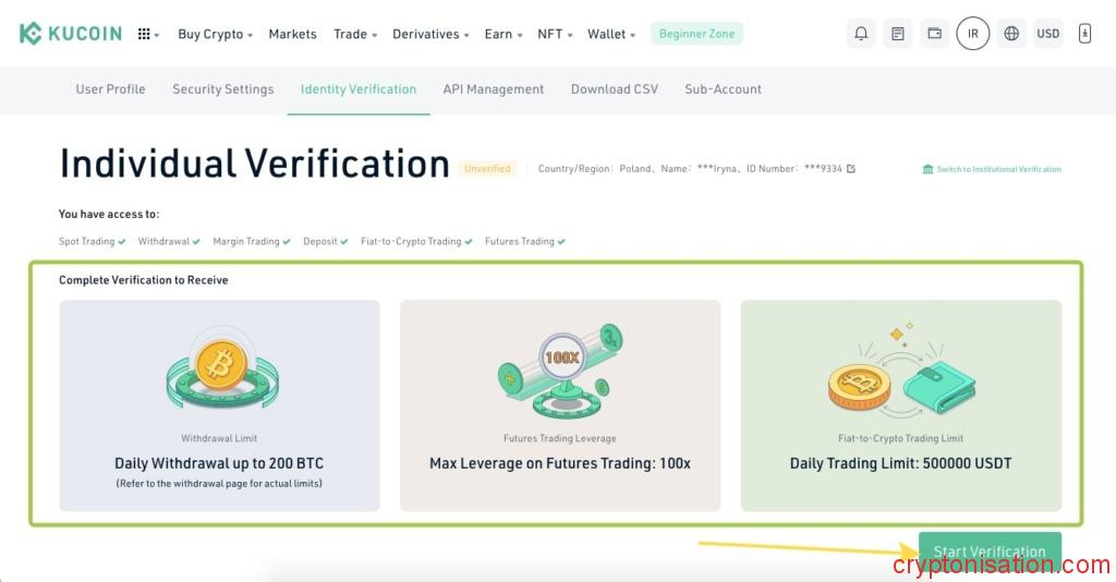 Weryfikacja tożsamości nie jest obowiązkową dla pracy na Kucoin. Dla użytkowników bez KYC dostępne są opcje: depozyt, spot, handel marżą. Istnieją jednak pewne ograniczenia, jak na przykład limit wypłaty do 1 BTC dziennie.