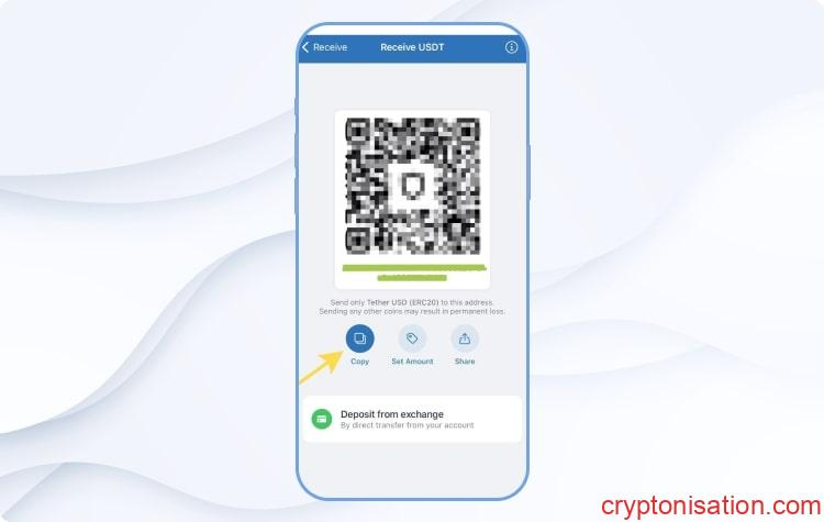 - Po wybraniu sieci system wygeneruje unikalny adres do wpłaty: skopiuj go lub zeskanuj kod QR;