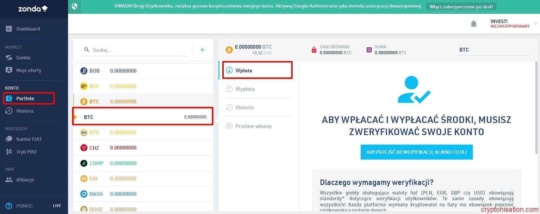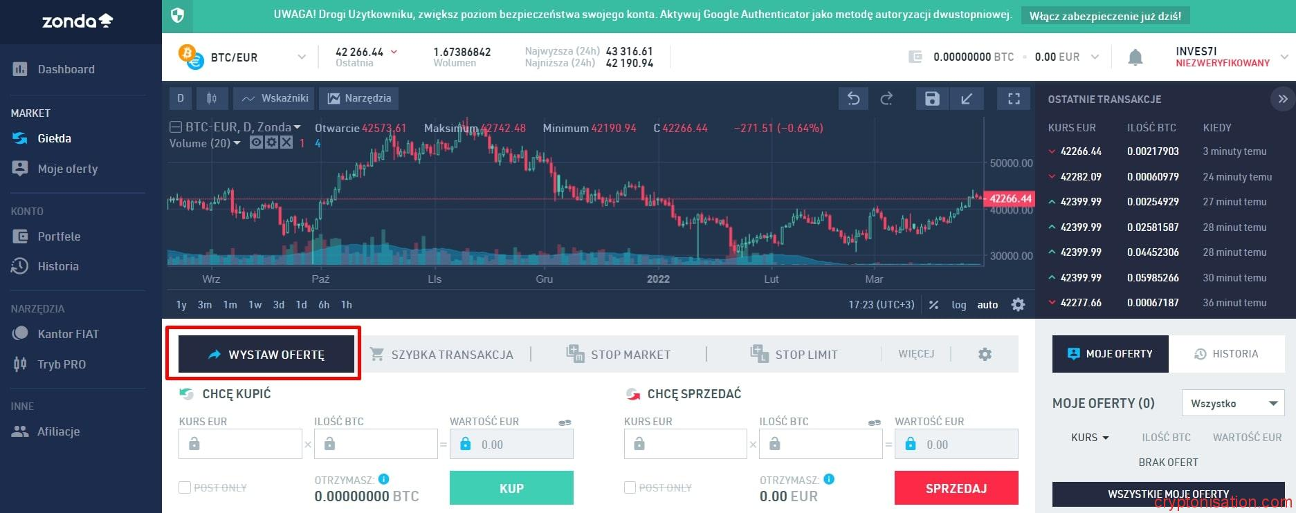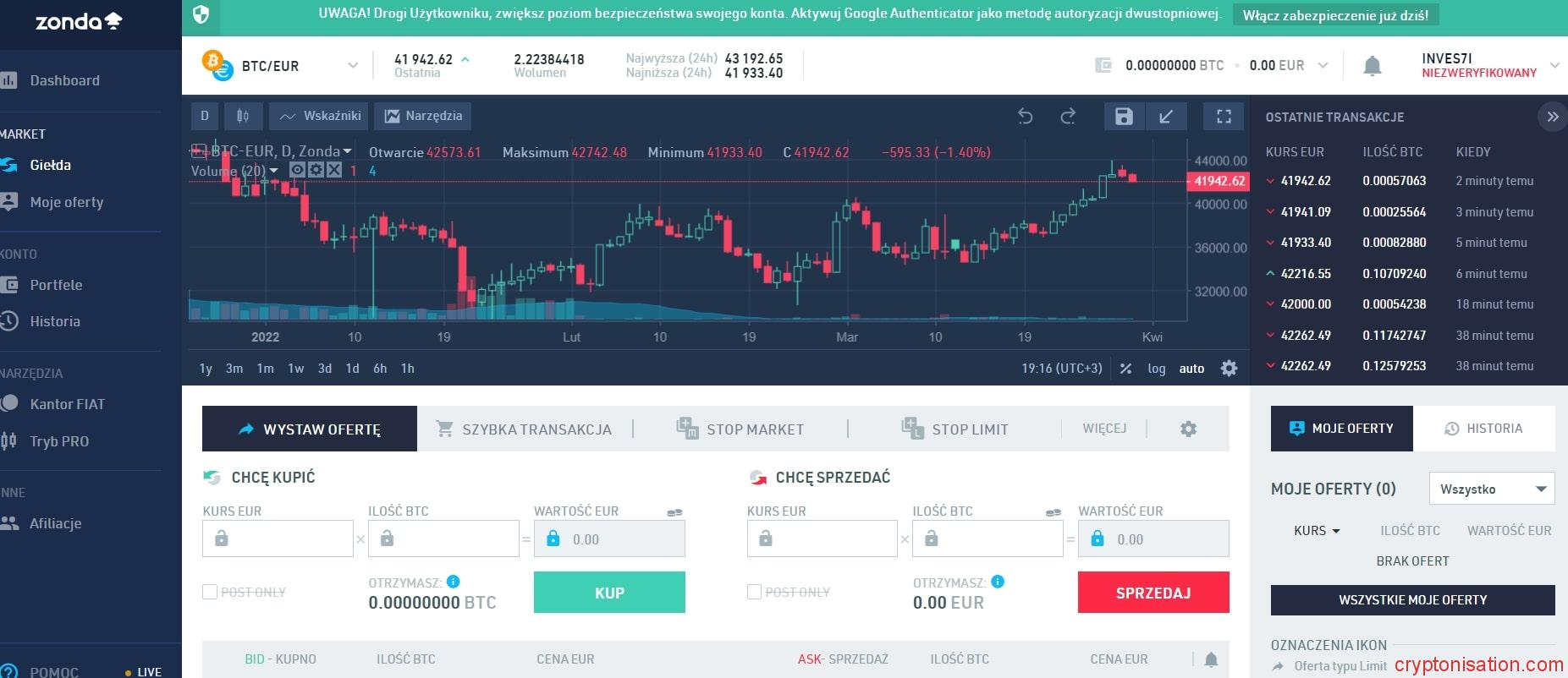 Po potwierdzeniu tożsamości użytkownika można korzystać ze wszystkich funkcji giełdy Zonda.