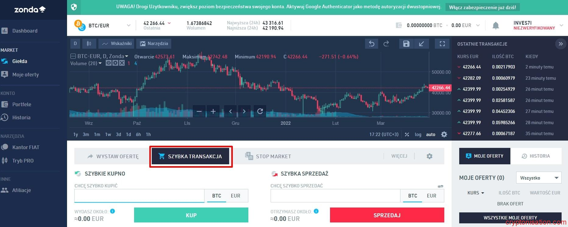 Najłatwiejszym sposobem na zakup BTC i innych kryptowalut jest zakup za PLN lub inne walute fiat. Przed dokonaniem zakupu należy wpłacić środki na giełdę. Jeśli chcesz natychmiast kupić lub sprzedać walutę cyfrową, lepiej wybrać opcję Szybka transakcja.