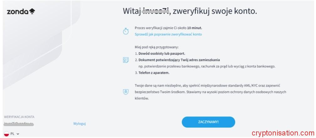 Zonda to regulowana giełda kryptowalut. Estoński organ regulacyjny, w którym zarejestrowana jest platforma, wymaga wdrożenia procedur KYC (know your customer). Proces weryfikacji przebiega w dwóch etapach: