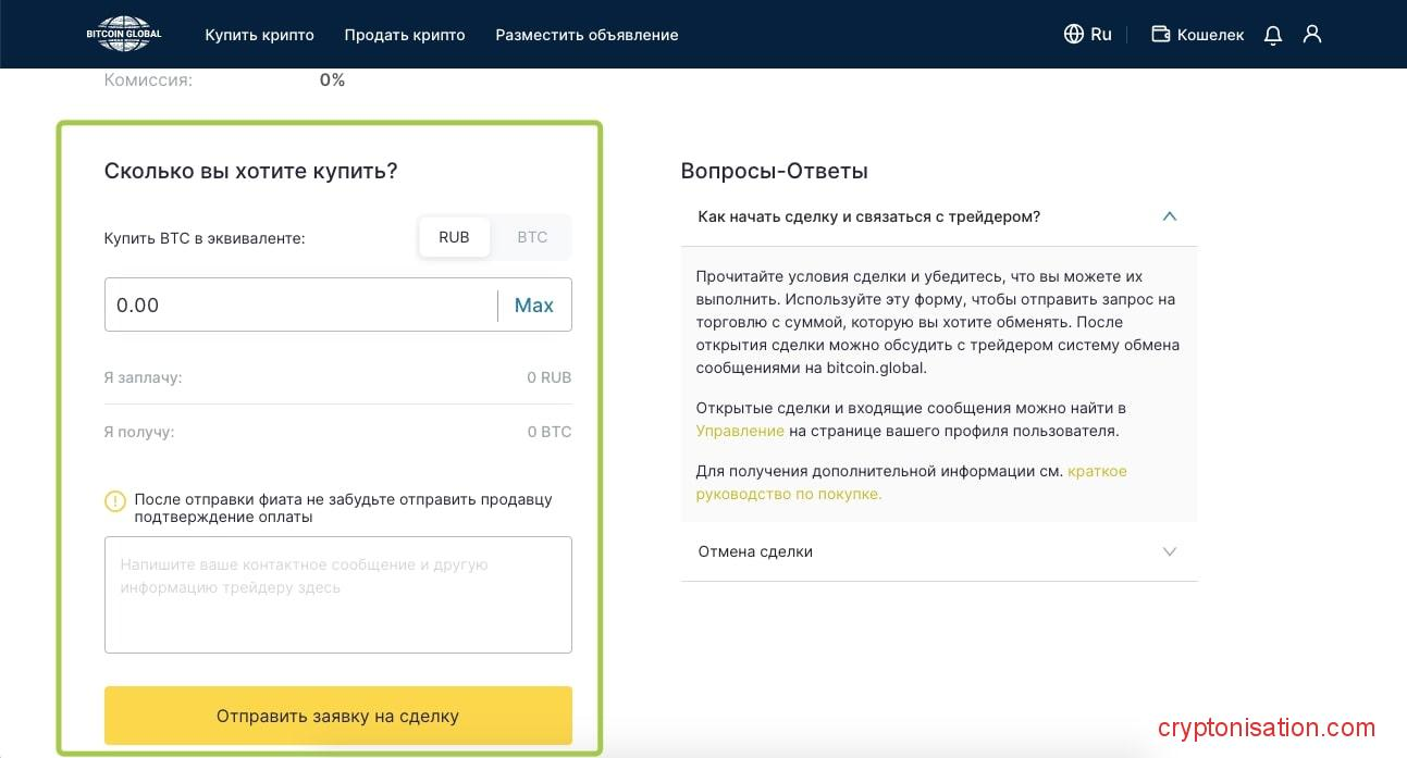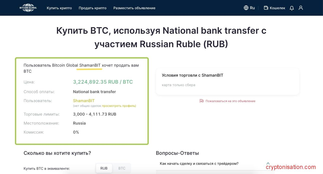 Bitcoin Global – это P2P-платформа, где пользователи могут покупать и продавать друг другу криптовалюту напрямую. Также можно создавать собственные объявления с указанием цены и способа оплаты и ждать встречного предложения.