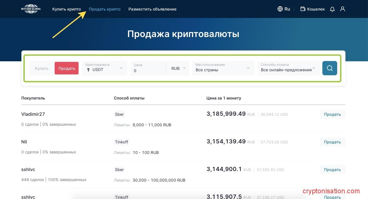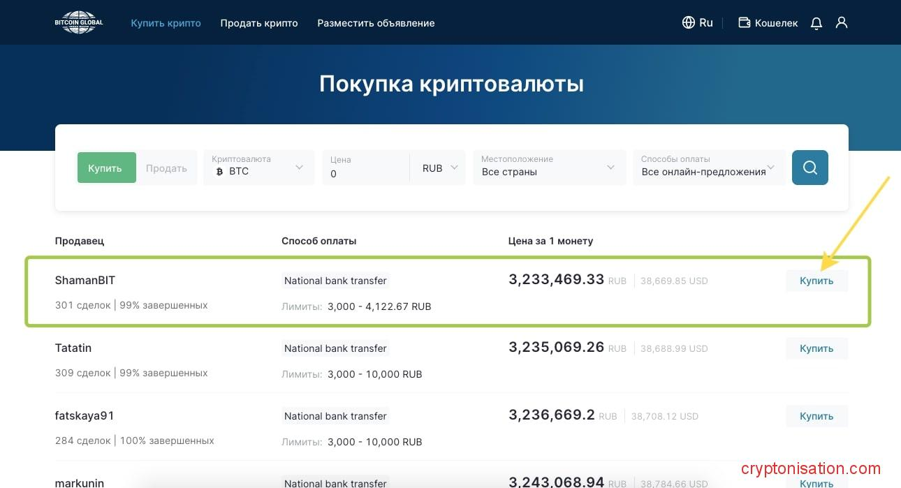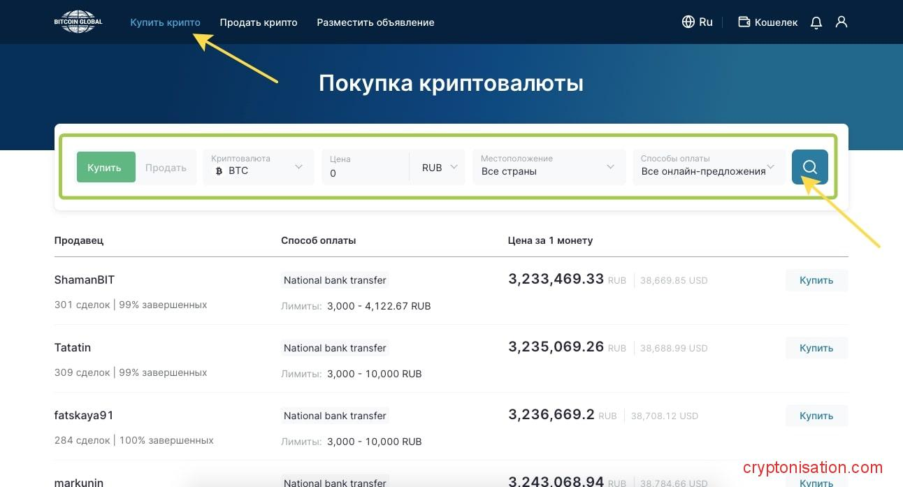 - На основании заданных параметров системе подберет для вас объявления о продаже нужной вам криптовалюты от разных продавцов;