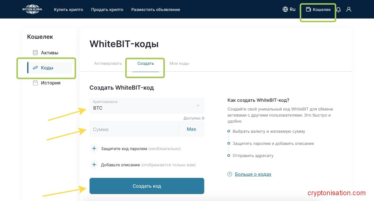 Платформа позволяет создать уникальный код WhiteBIT для обмена активами с другими пользователями. Создать биржевой код WhiteBIT можно для следующих криптовалют: bitcoin, ethereum, tron, tether, hoge.