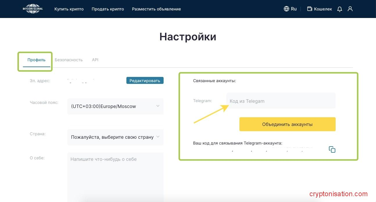 Во вкладке Настройки → Профиль вы найдете код для связывания вашего Telegram и биржевого аккаунта.