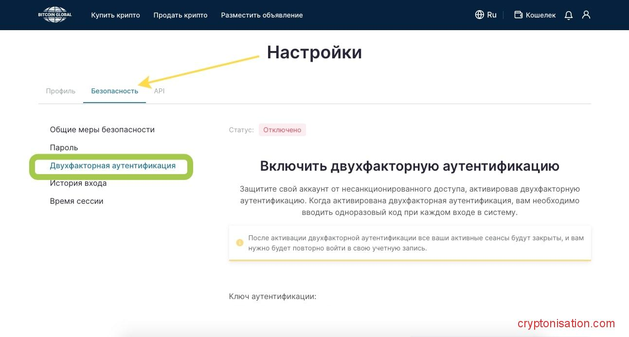 Чтобы защитить свой аккаунт на Bitcoin Global, а также получить возможность отправлять средства, нужно включить двухфакторную аутентификацию. Для этого заходим в раздел Настройки → Безопасность → Двухфакторная аутентификация.