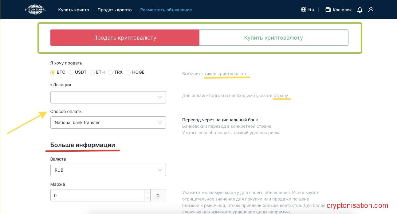 Инструкция, как создать объявление об обмене криптовалюты:
