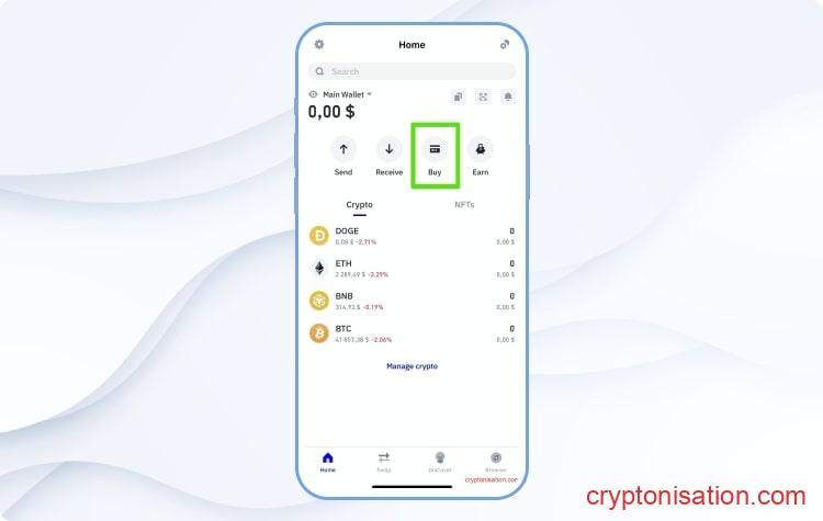 - Cumpărarea de criptomonede de pe un card în interiorul portofelului. Această opțiune oferă utilizatorilor acces rapid și direct la achiziționarea de criptomonede pentru bani fiat, minimizând inconvenientele asociate cu comutarea între diferite servicii;