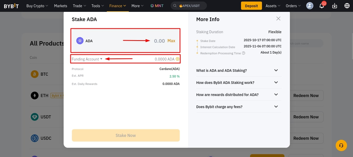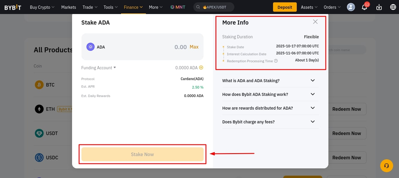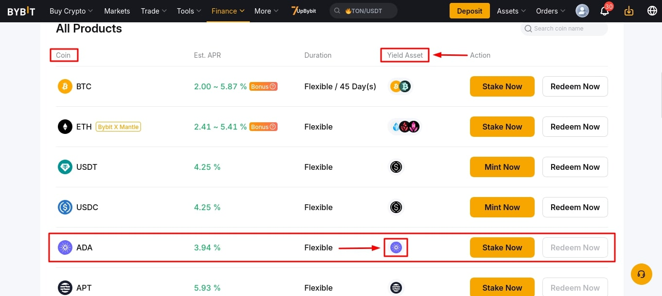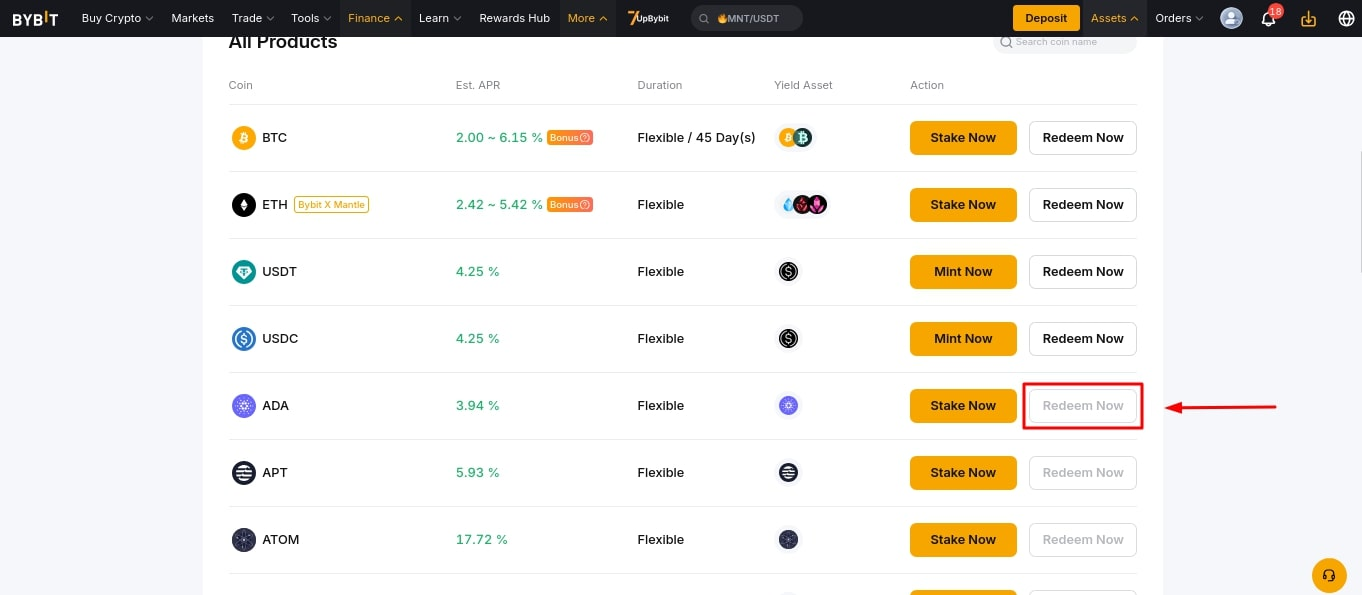 - Перейдите в раздел Finance → Earn → On-Chain Earn. В списке выберите монету, которую хотите вывести, например, ADA, и нажмите Redeem Now;