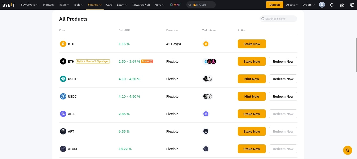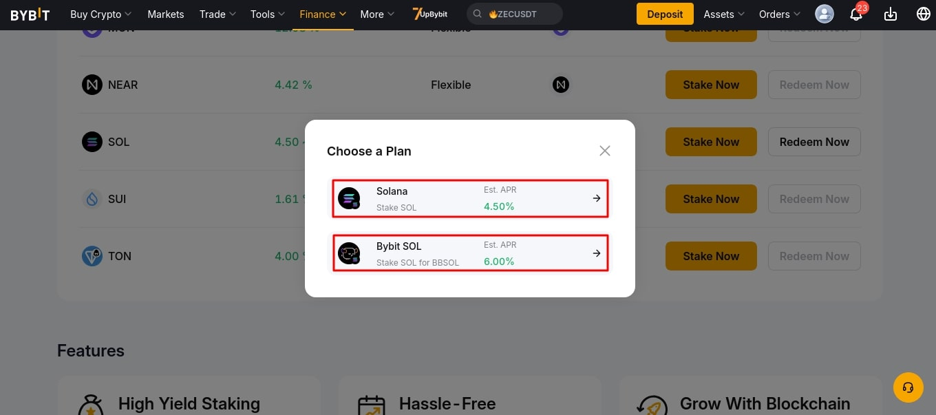 Основная программа стейкинга на бирже ByBit представлена в разделе On-Chain Earn (Finance → Earn → On-Chain Earn). На площадке есть и другие программы: стейкинг в Лаунчпуле и маржинальный стейкинг SOL.