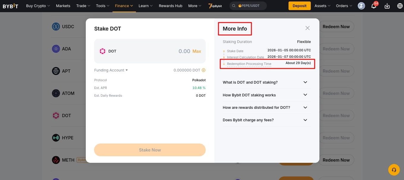 - В открывшемся окне укажите количество монет для вывода и подтвердите операцию, нажав Redeem Now. Монеты поступят на аккаунт финансирования (Funding Account) после процесса разблокировки.