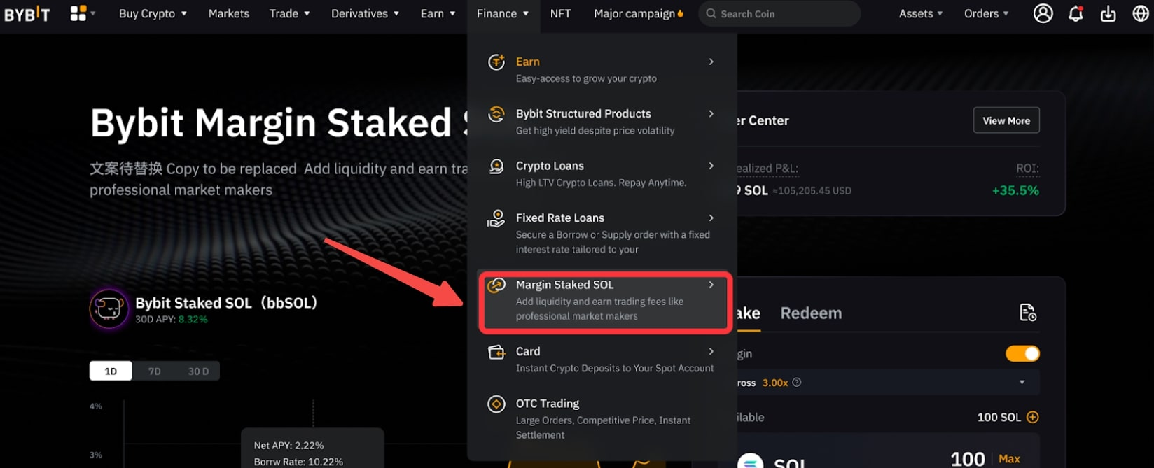Для перехода в раздел «Маржинальный стейкинг SOL» выберите Finance → Margin Staked SOL.