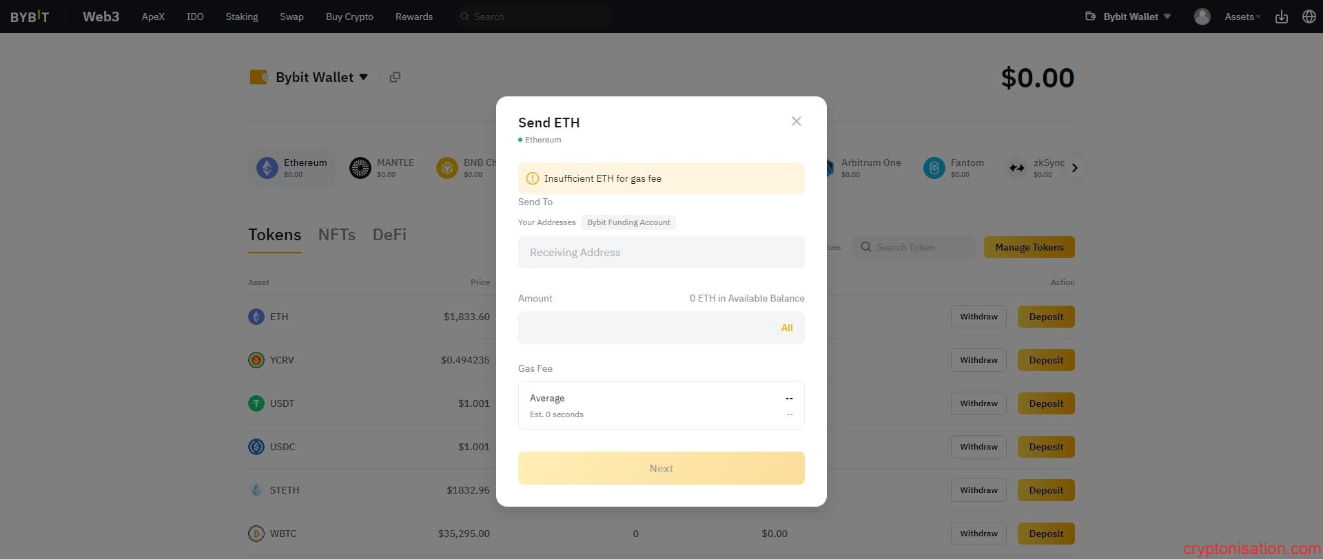 Bybit Wallet’tan para çekmek için, uygulamanın gelişmiş arayüzüne geçmelisiniz. ETH kripto para birimini çekme işlemini örnek olarak ele alalım: