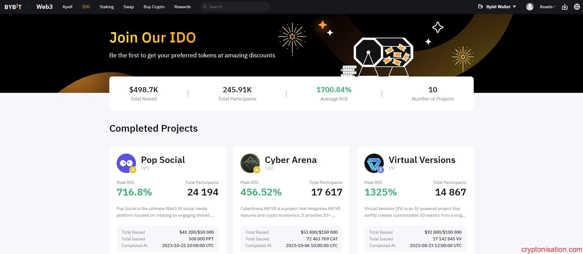 Dahili IDO (Initial Dex Offering – DEX borsasında ilk token arzı) servisi, Bybit Web3 ekosistemi içinde token arzının erken dönemlerine katılma olanağı sağlar. Arzda yer almak için, projede belirli miktarda BNB veya USDT kilitlenmesi gerekmektedir. Projeye katılan kullanıcılar, çekiliş sonucuna göre tokenler alırlar.