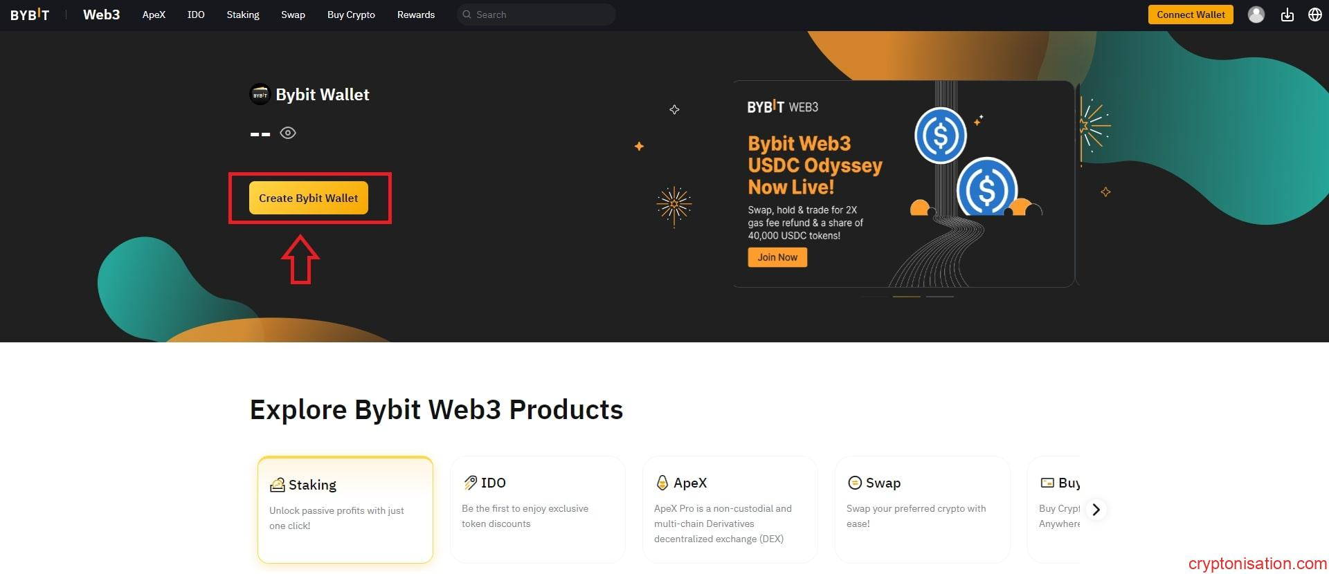 Ana sayfadaki Bybit Wallet sekmesi - Create Bybit Wallet düğmesine basın;