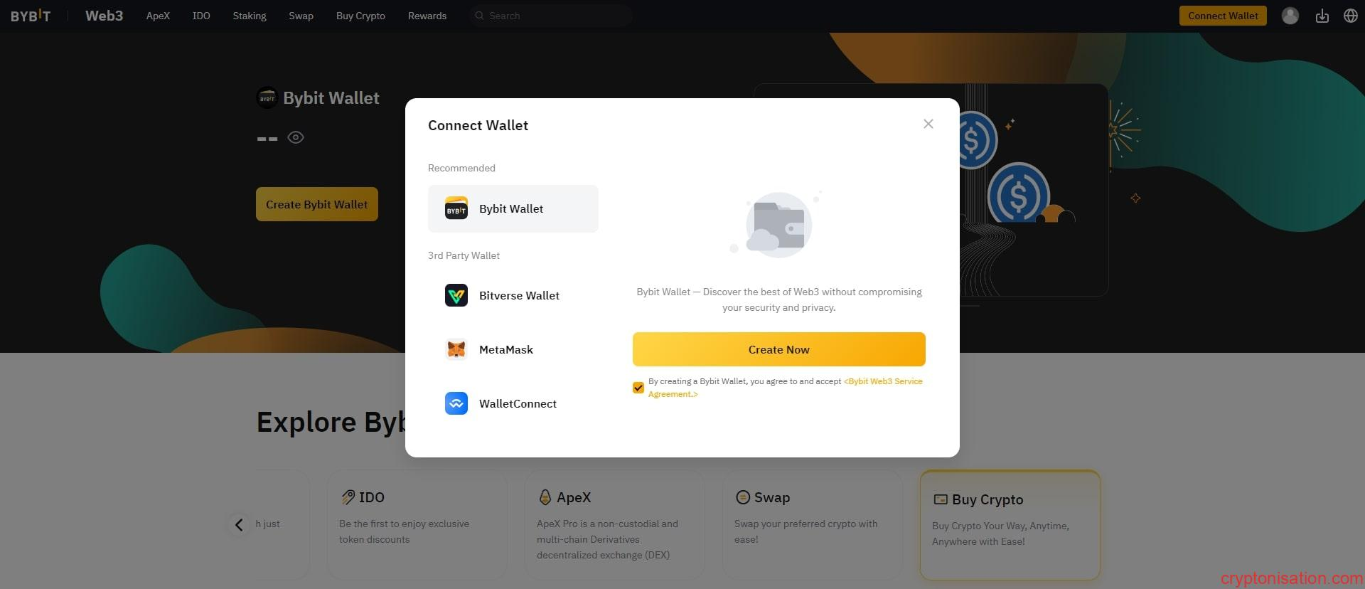 Create Bybit Wallet düğmesi - Connect Wallet penceresinde Bybit Wallet‘ı seçin ve Create Now‘a tıklayın;