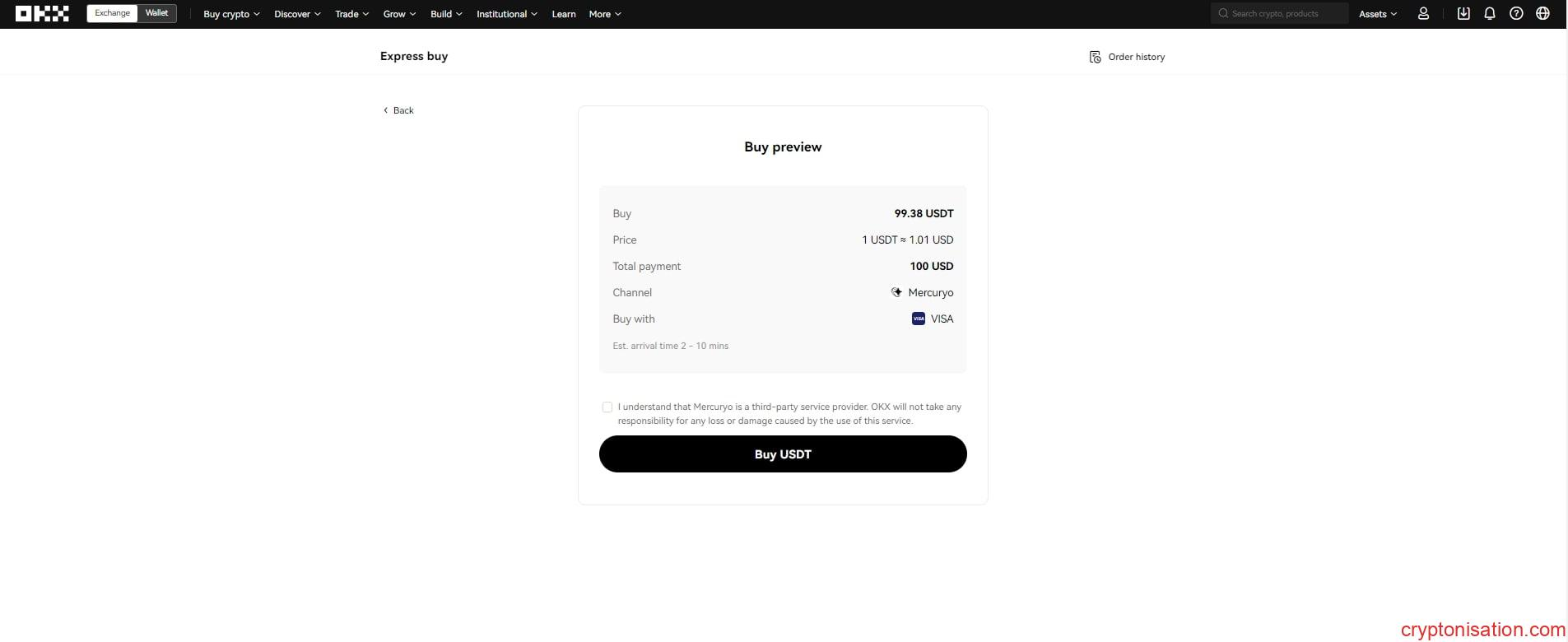 USDT Satın Alma İşlemi için Kullanılabilir Ödeme Yöntemleri Listesi - İşlem koşullarını onaylayın ve kutucuğu işaretleyin → Next;