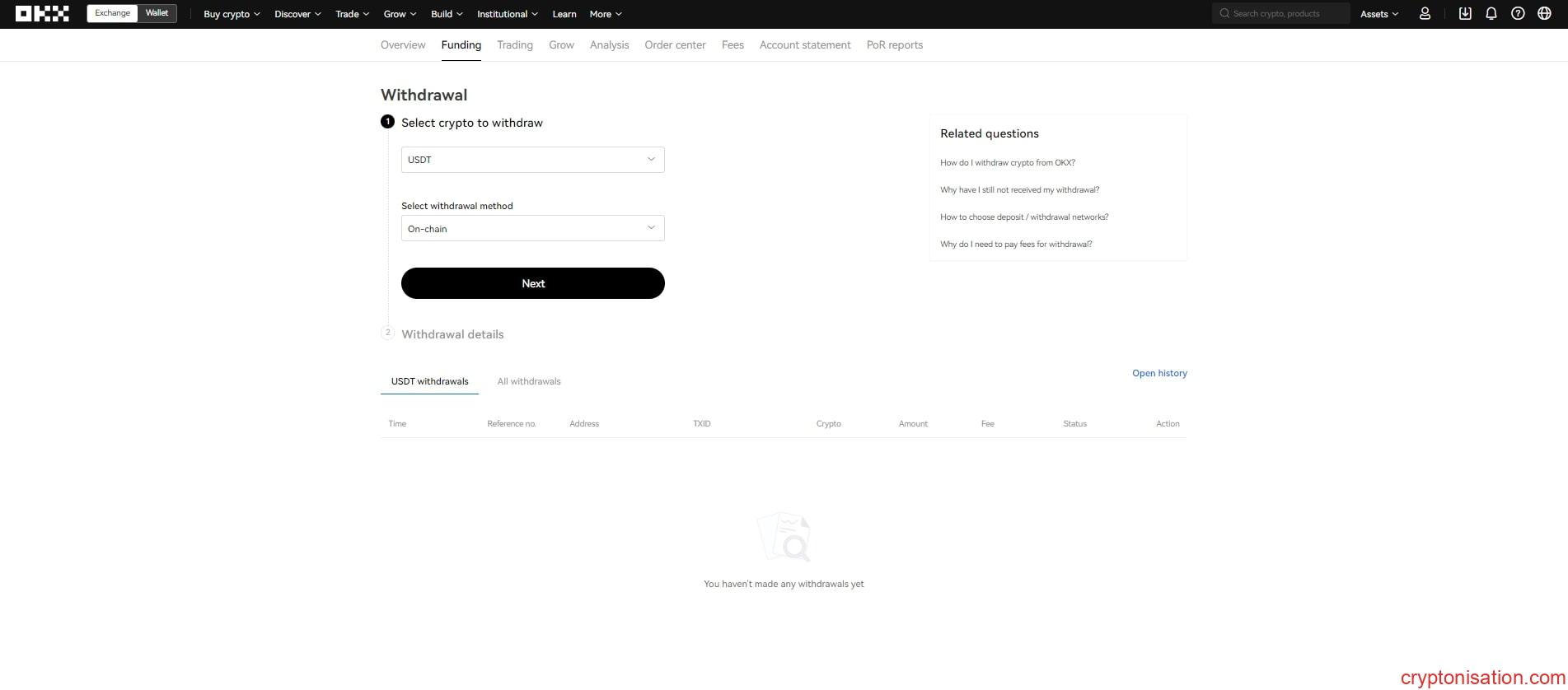 Para Çekme Menüsü - Çekmek istediğiniz coin’i seçin (örneğin, USDT) ve işlem türünü (Borsa Dışı, On-chain) seçin → Next;