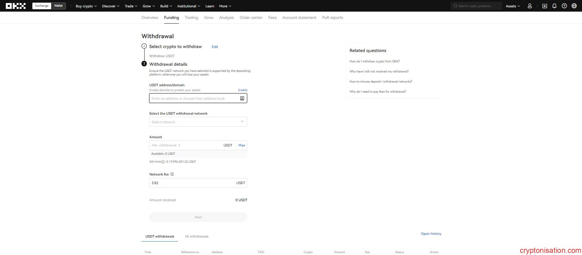 Çekmek İstediğiniz Coinin Seçimi - Sonraki sayfada, USDT Adresi alanına çekmek istediğiniz coin için adresinizi girin, Withdrawal Network (Çekme Ağı) alanında ise işlemlerin gerçekleştirileceği ağı seçin (borsa ve çekmek istediğiniz cüzdan arasındaki ağlar aynı olmalıdır). Amount (Miktar) alanına çekmek istediğiniz coin miktarını girin. Borsa, ağdaki mevcut yüküne bağlı olarak çekim ücretini otomatik olarak hesaplayacaktır;