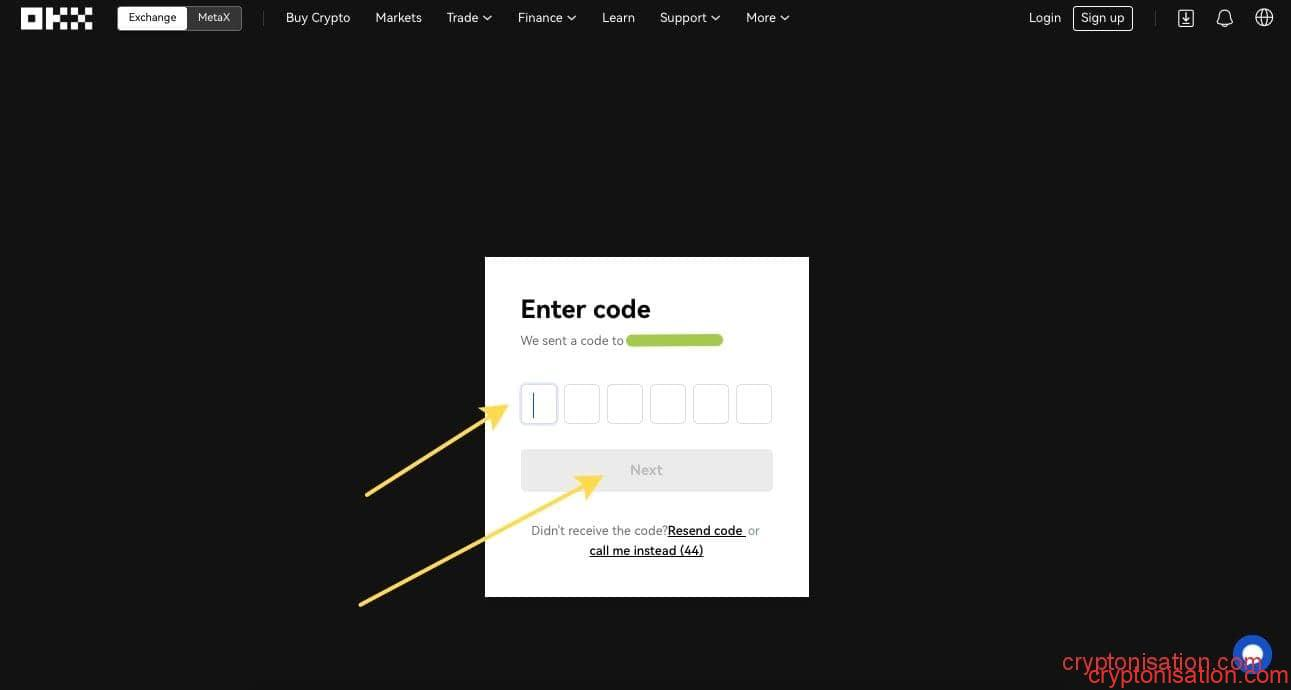 OKX’te Hesap Oluşturma - Kayıt işlemini onaylamak için e-posta ile alınan 6 haneli kodu girin → Next;