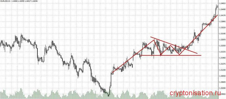 Наиболее часто встречающиеся фигуры — коррекционные движения после роста и дальнейший пробой в сторону тренда.
