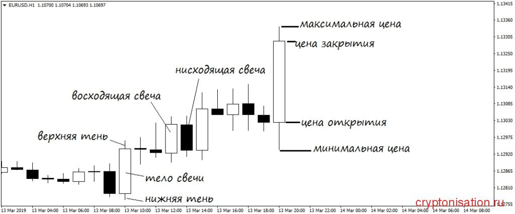 Как можно догадаться из названия, свечной график состоит из свечей, каждая из которых включает в себя один временной период и отображает сразу 4 цены – цену открытия и закрытия, максимальные и минимальные цены. Расстояние между ценой открытия и закрытия называют телом свечи.