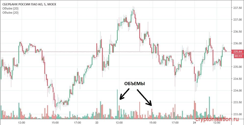Анализ объемов с помощью графиков TradingView представляет собой обычную гистограмму, где каждый столбик отвечает за отдельный временной промежуток. То есть если выбрать таймфрейм 5 минут, то показатель объемов будет учитывать количество акций или лотов за каждые отчетные 5 минут. Размер столбиков зависит от размера сделок: чем больше объем, тем выше полоска.