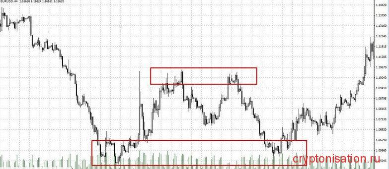 Как правило, цена “болтается” возле линий поддержки и сопротивления в небольшом канале. Поэтому вместо линий часто чертят канал, который охватывает тени свечей, которые “щупали” линию, но не смогли ее пробить.